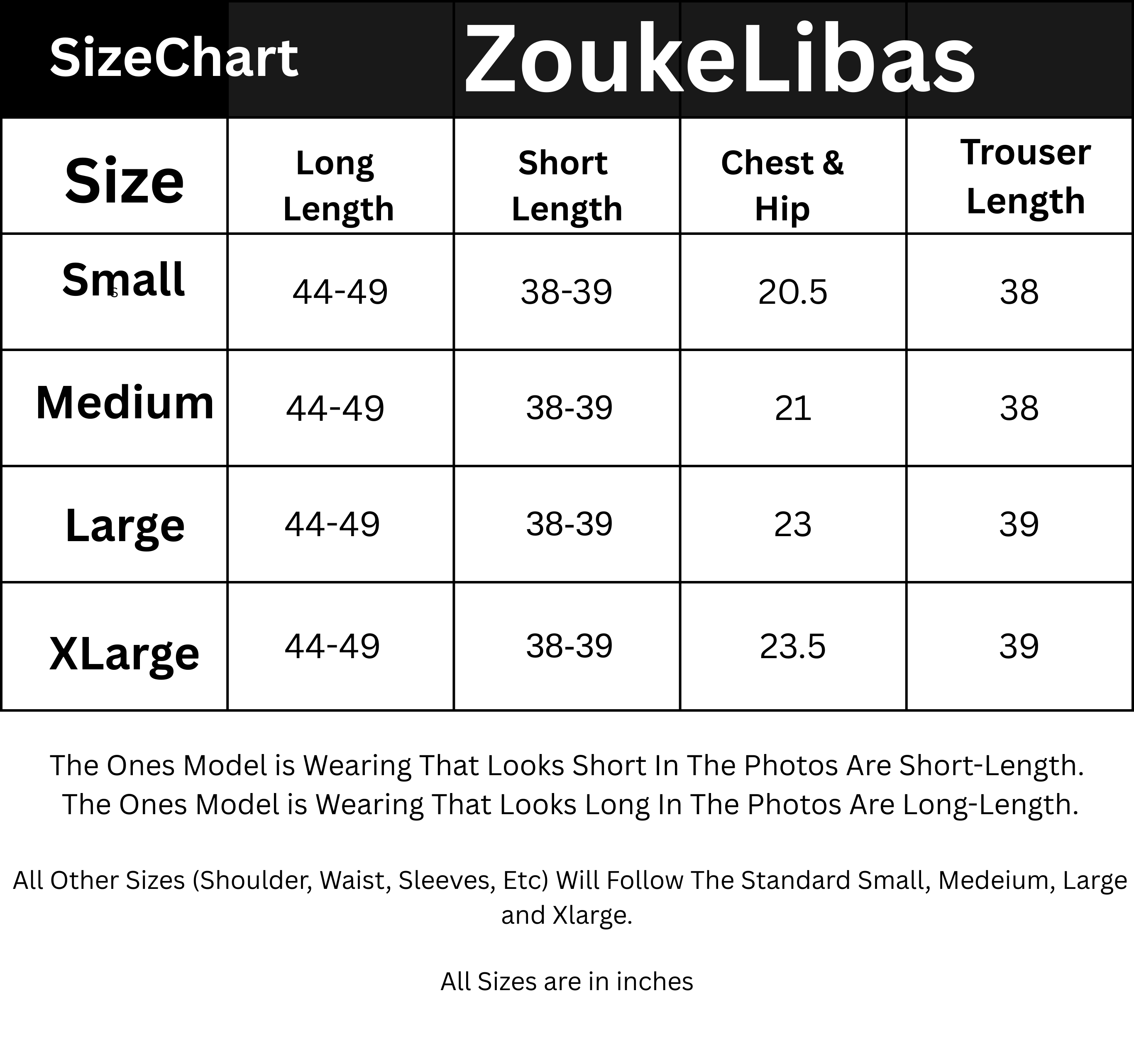 - Small: Chest – 20.5”, Shirt Length – 47”, Trouser Length – 38”–39”,